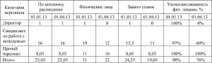 Укомплектованность штатов в разрезе категорий персонала в МБУ «Городской молодежный центр» по состоянию на 01.01.2013 г. и на 01.04.2013 г. составляла: